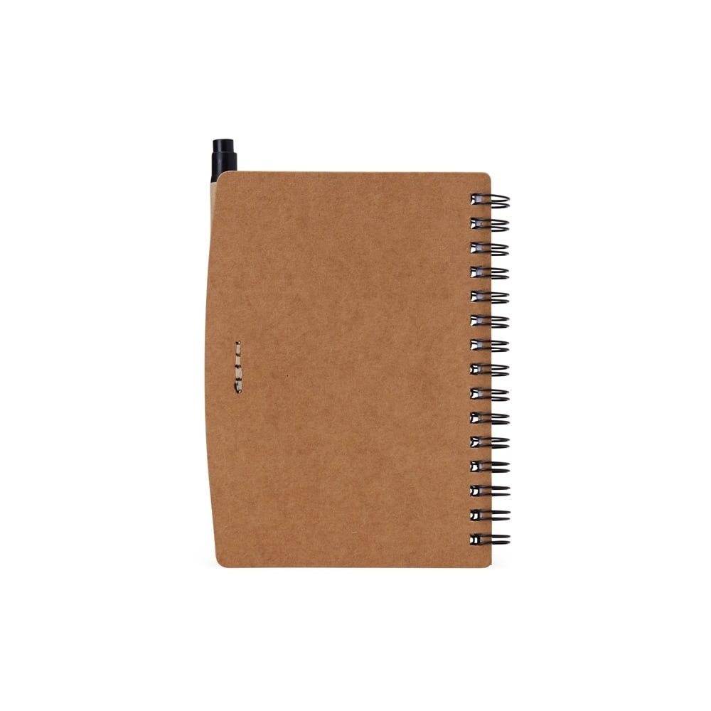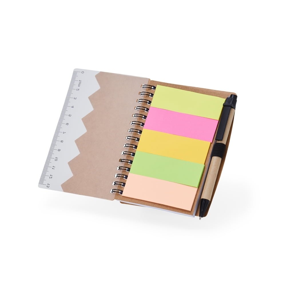 Bloco de anotações ecológico com autoadesivos, régua e caneta, feito em kraft: Contém folha com régua 13 cm, cinco autoadesivos com aproximadamente 13 folhas, bloco com aproximadamente 69 folhas brancas com pauta, porta caneta elástico e acompanha caneta de papelão com detalhes plásticos, carga esferográfica azul 1.0mm e acionamento por clique.