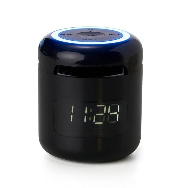 Caixa de Som Relógio Atacado : Caixa de som multimídia com relógio despertador. Produzida em plástico e com borrachas antiderrapantes na área inferior, a caixa de som tem bateria de longa duração, display de LED na área frontal, e anel de led brilhante na parte superior. A caixa de som executa nos modos bluetooth, rádio FM, cartão TF-microSD e entrada auxiliar P2. Acompanha cabo USB e manual em inglês e chinês.
