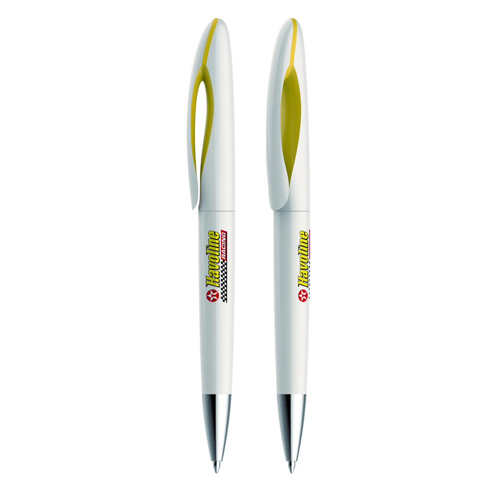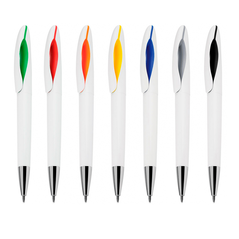 Caneta Personalizada Em Jundiaí : branca com detalhe colorido. Clip plástico com detalhe interno colorido.
