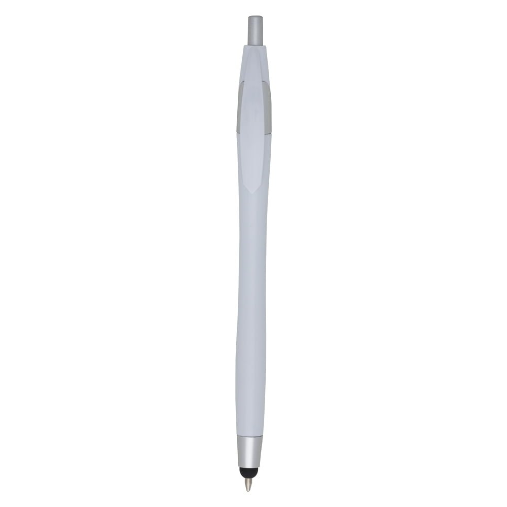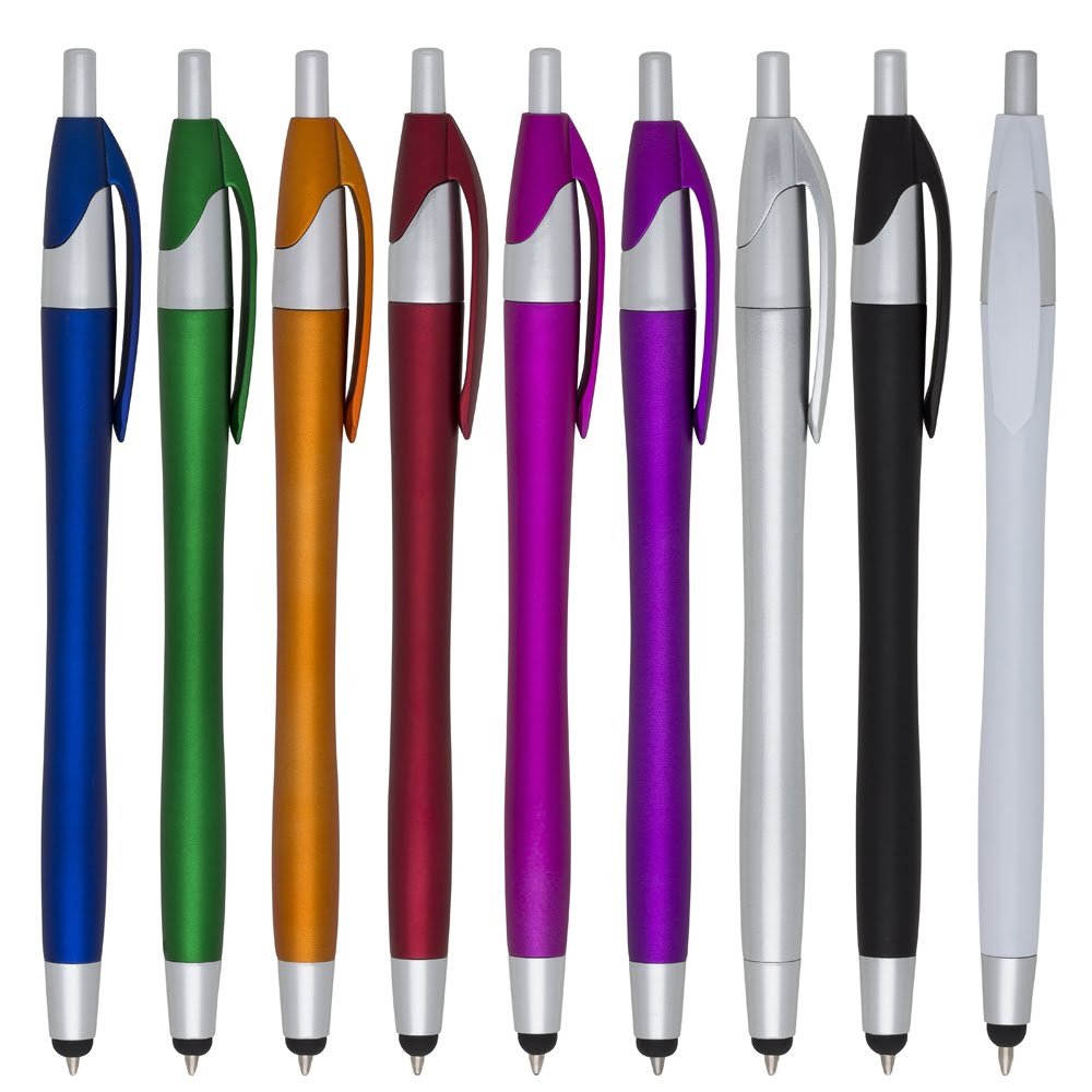 Caneta Plástica Personalizada Salvador: com ponteira touch, inteira colorida com detalhes prata. Aciona por clique, ponteira sai através da borracha touch.