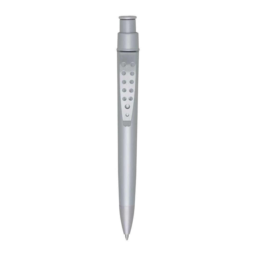 Caneta Plástica Personalizada No Atacado: Fosca inteira colorida com detalhes prata. Clip de metal com doze furos, aciona por clique.