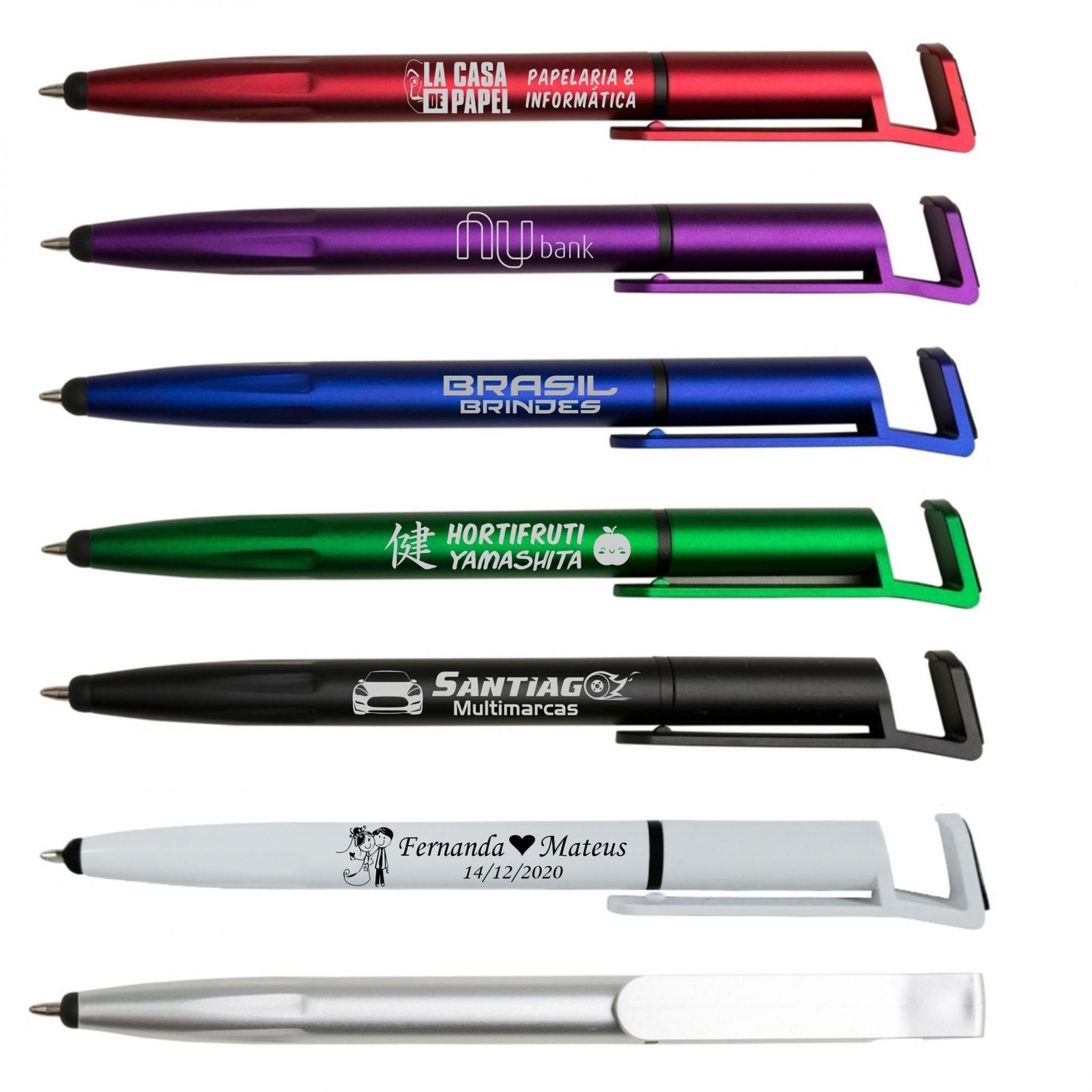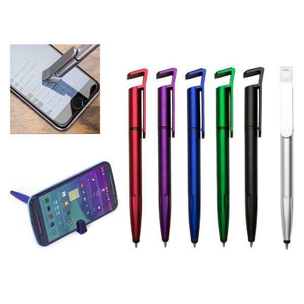 Caneta Plástica Personalizada Florianópolis: Touch com suporte para celular, caneta inteira colorida com detalhes preto. Clip plástico aberto utilizado como suporte para o celular e parte superior com limpador de tela, possui anel preto abaixo do clip e parte inferior com detalhes em relevo.