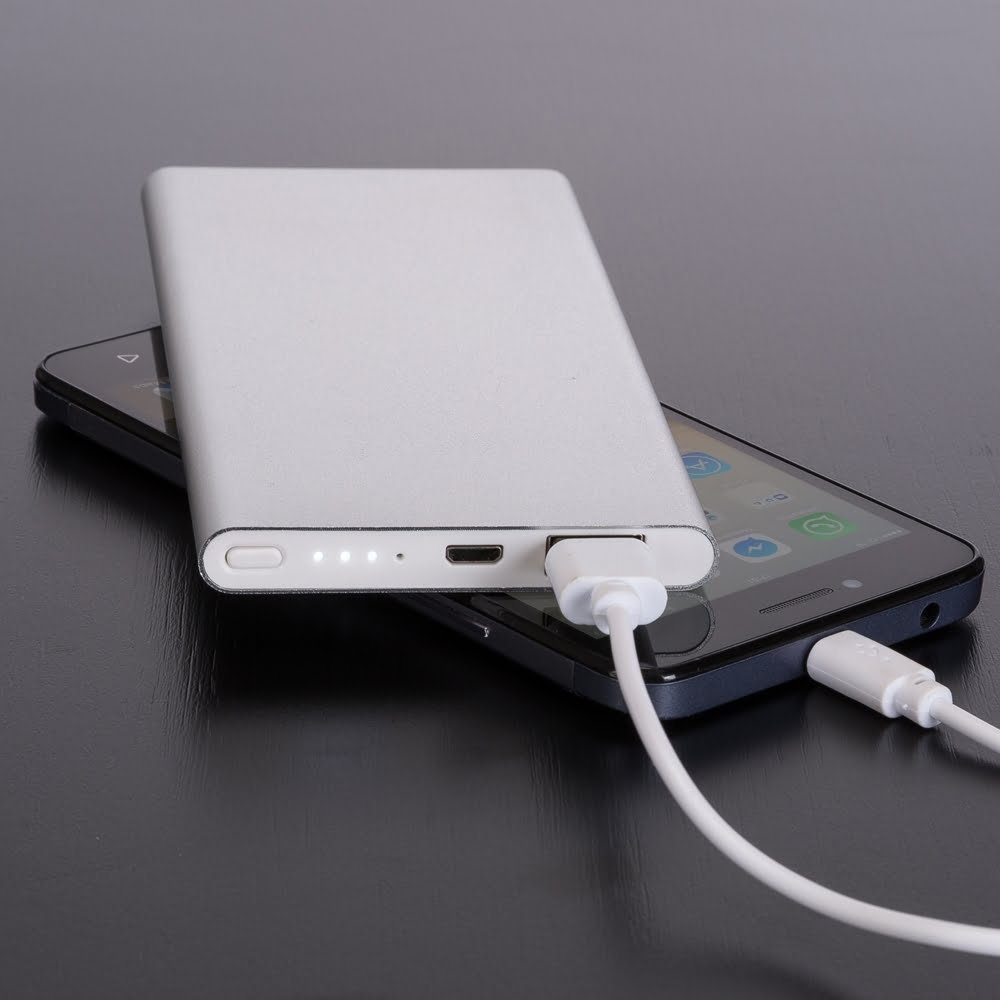 Carregador Portátil Atacado: Com indicador de carga em led. Corpo metálico de design fino com detalhe branco nas laterais, “entrada” e “saída” de 5v, 4 indicadores de carga em led branco e botao liga/desliga, 2800 mAh. Acompanha cabo USB.
