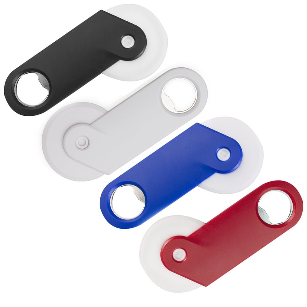 Cortador De Pizza Personalizado: Cortador de pizza e abridor de garrafas Em plástico resistente branco e corpo colorido, possui abridor prata no parte inferior.