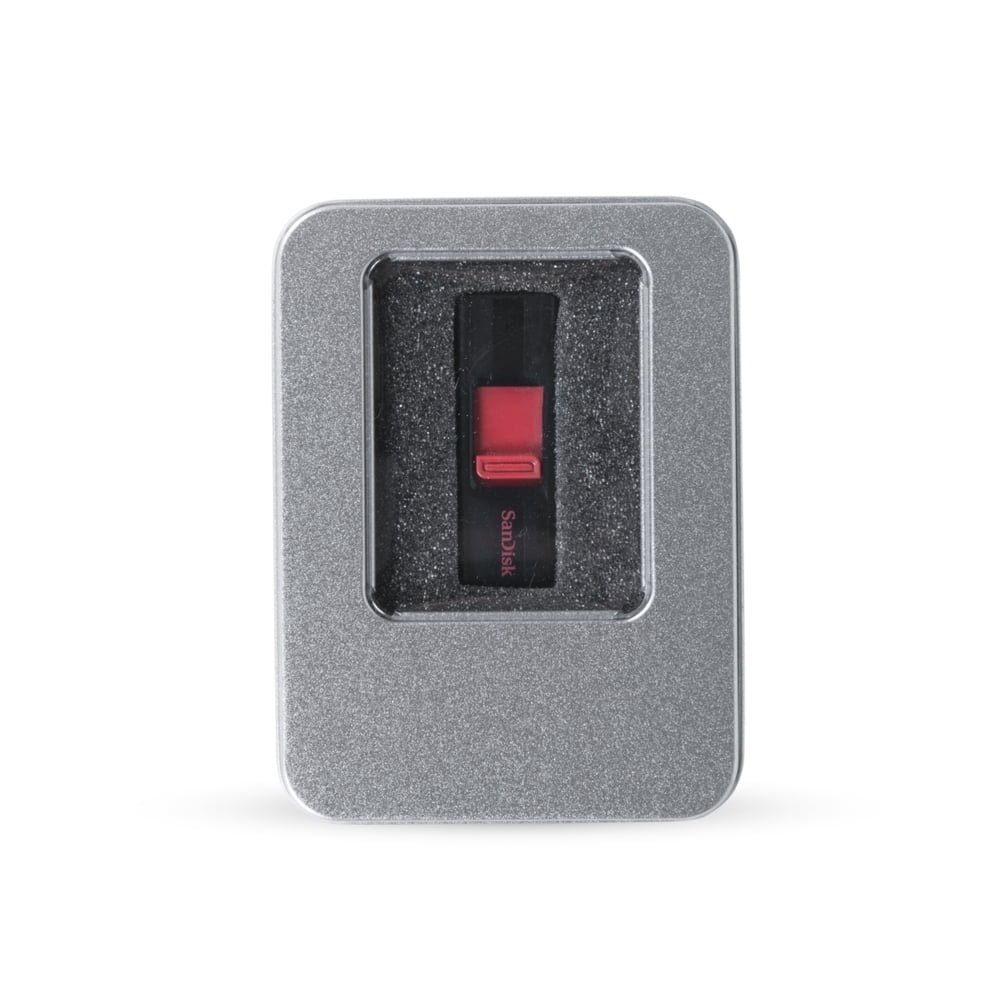 Estojo De Pen Drive Para Brindes: Material de metal com tampa, proteção em espuma preta macia para não arranhar o material interno.