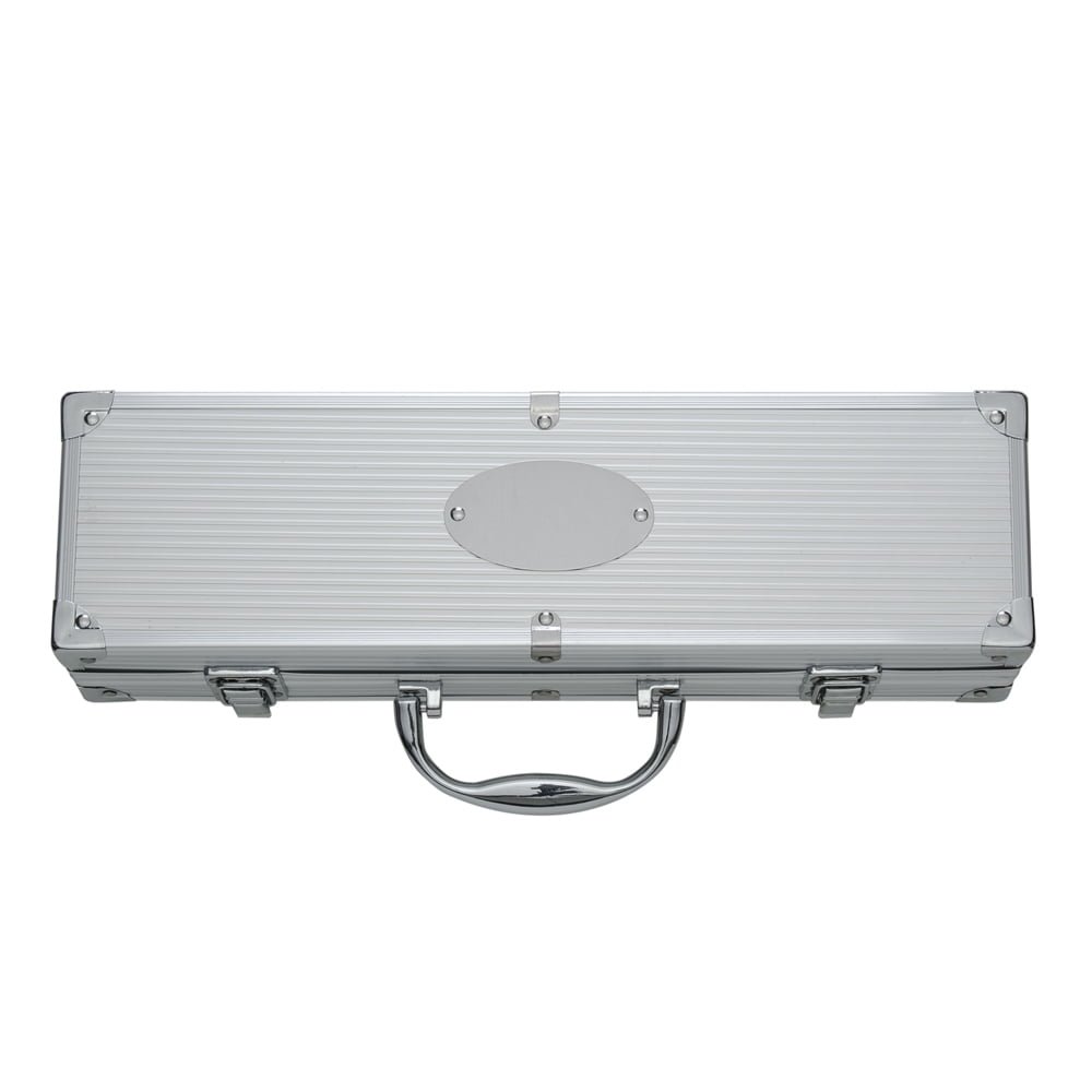 Kit Churrasco Eventos: Kit churrasco 4 peças em maleta de alumínio com travas de segurança, contém: espátula, pegador, garfo e faca em inox. Parte interna da maleta com revestimento em tnt e suportes de velcro para fixação das peças.