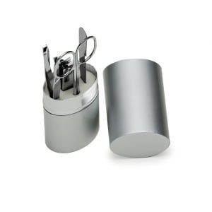 Kit Manicure Para Eventos: Em estojo oval de alumínio. Possui lixa, tesoura, pinça, empurrador de cutícula e cortador de unha.