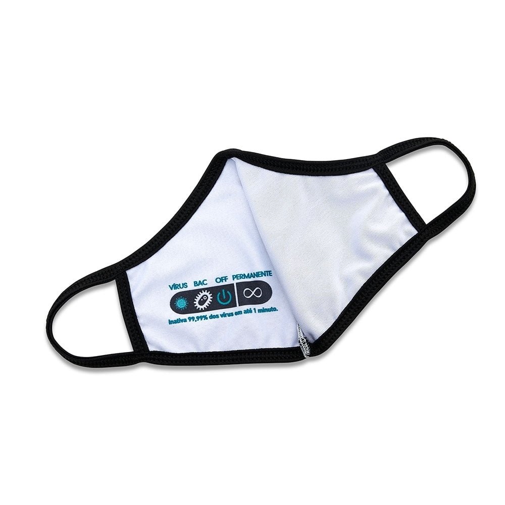 Máscara Reutilizável Personalizada: Máscara antiviral e antibacteriana de dupla camada confeccionada em fio têxtil de poliamida. O agente antiviral presente na matriz polimérica do fio de poliamida tem correlação eletrônica com regiões de proteínas da estrutura externa do vírus, impedindo a instalação em células humanas, bloqueando assim a contaminação.